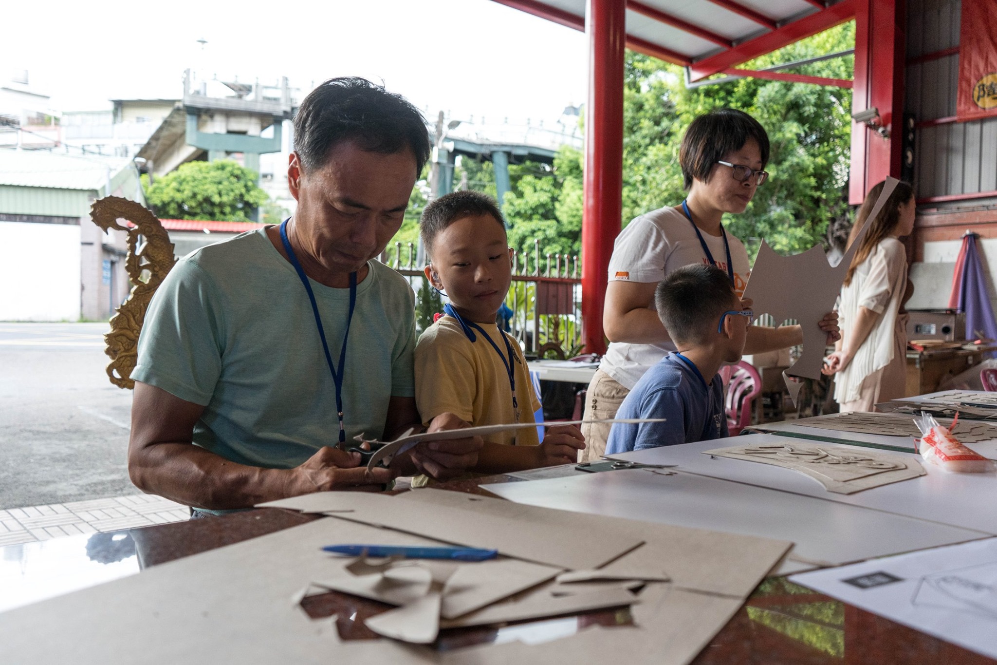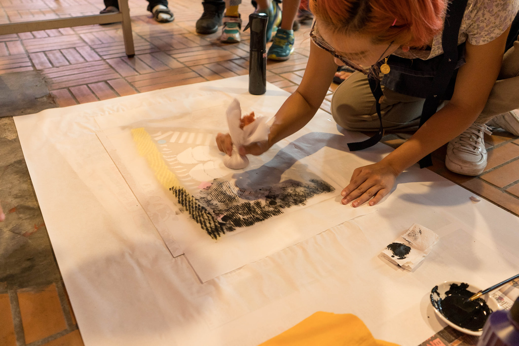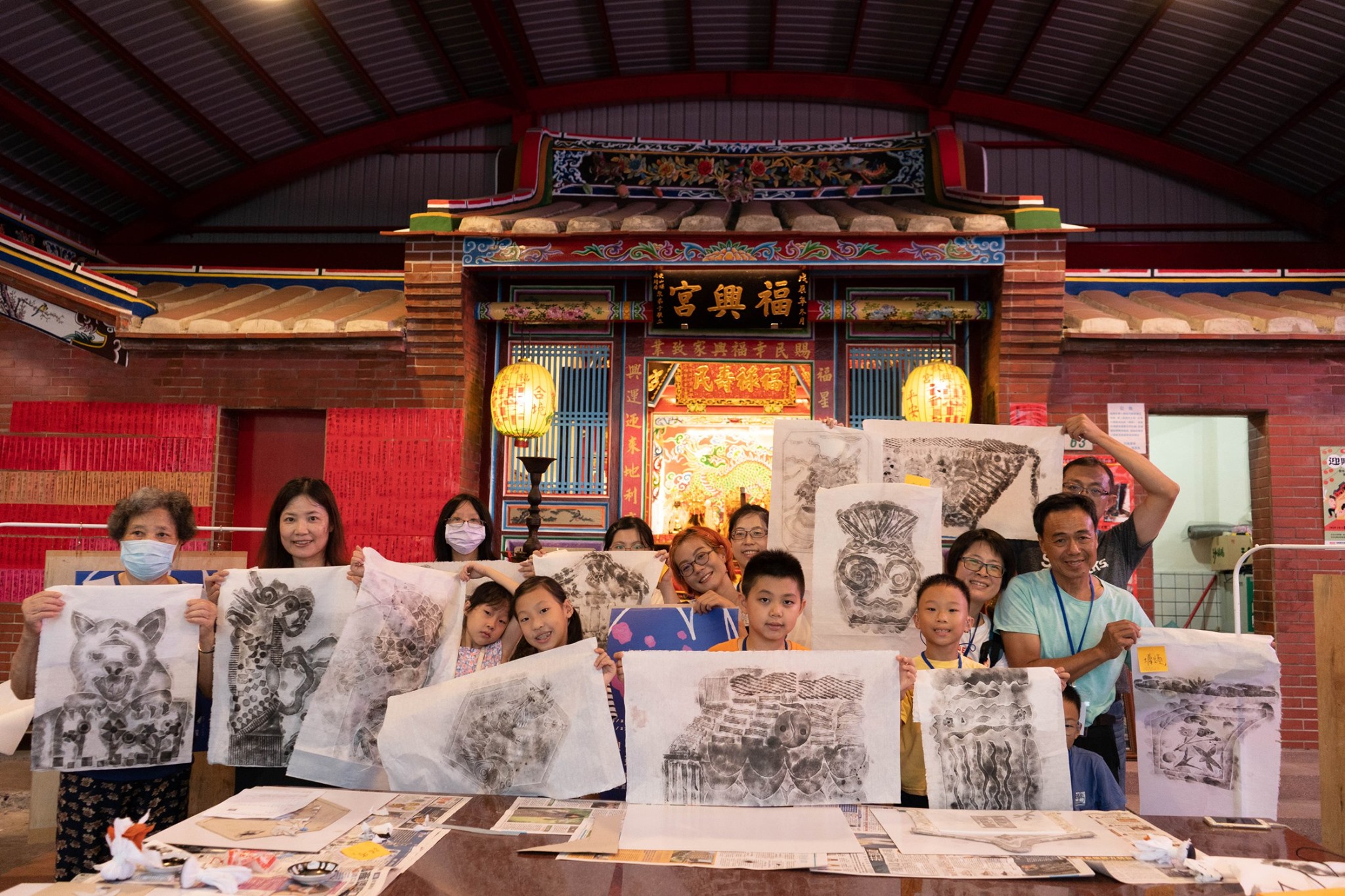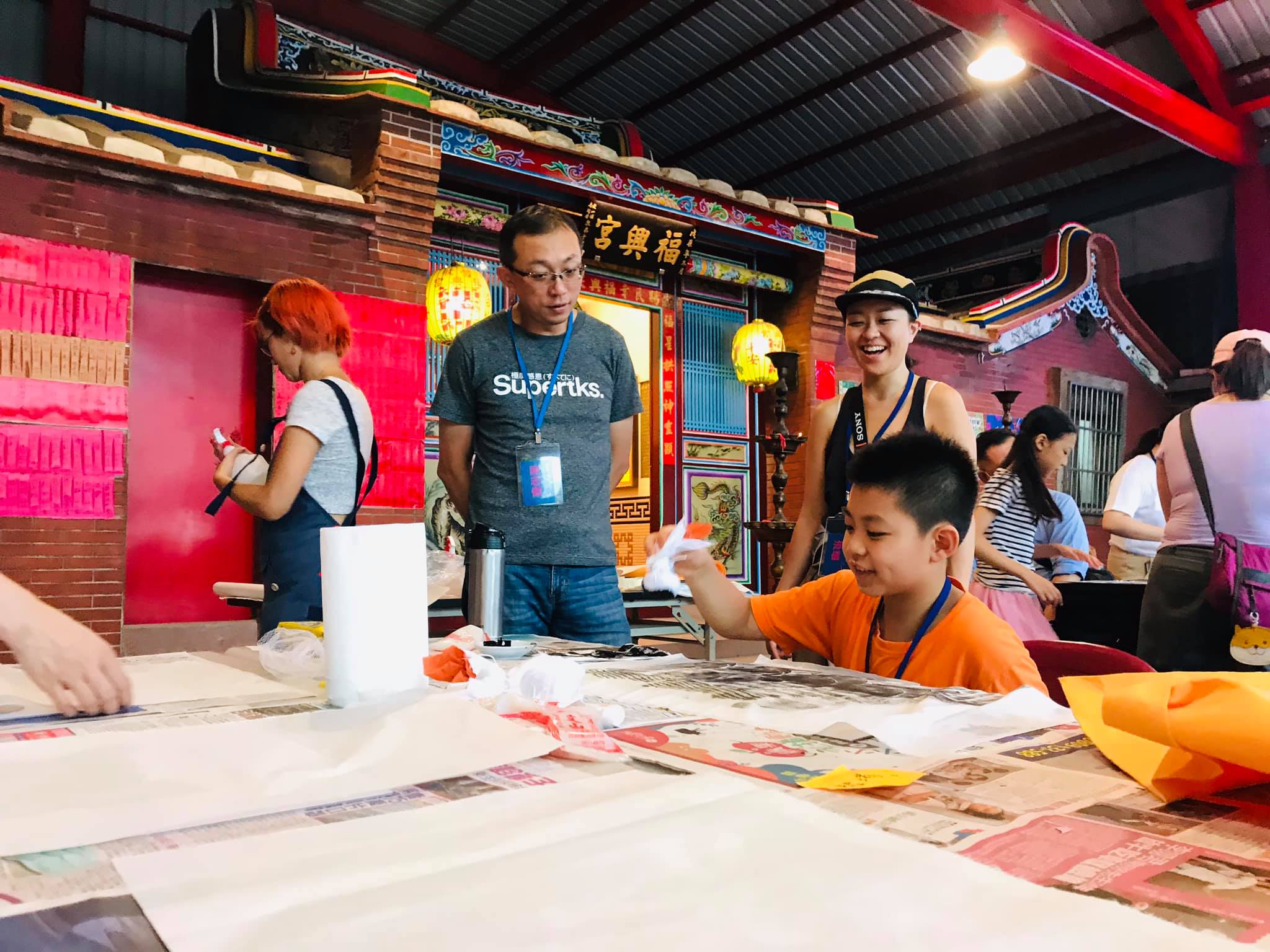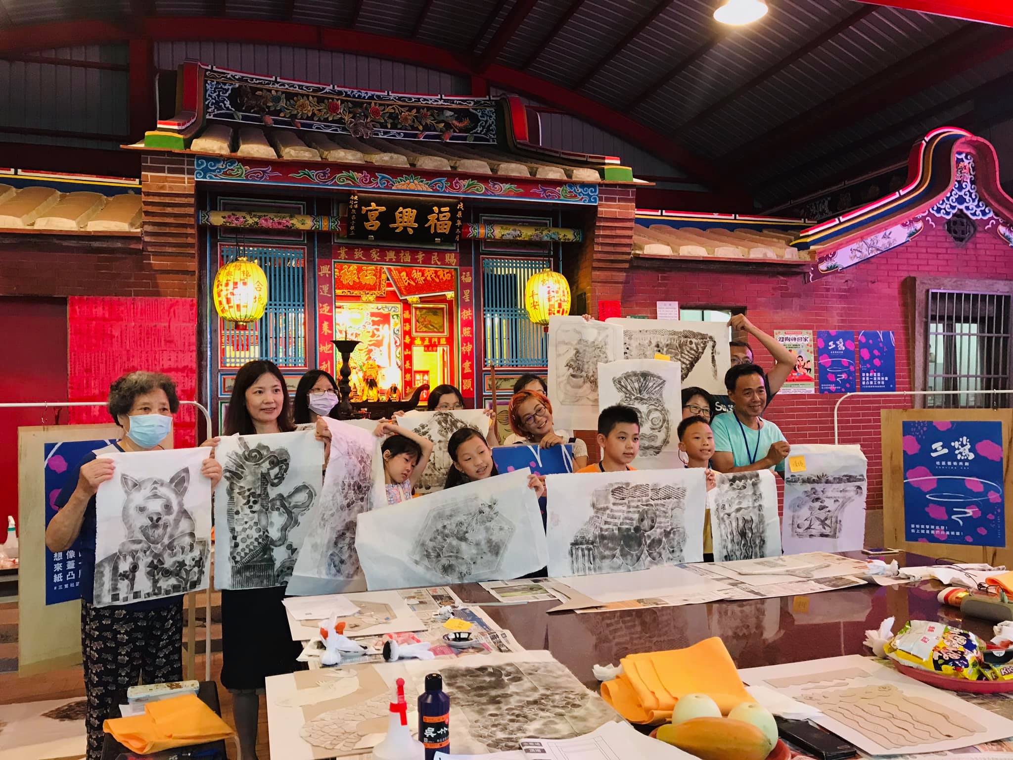 工作坊以介紹陶神信仰、傳統廟宇建築形制為出發,搭配日常生活也能也操作的紙凸版、隨手可得的現成物肌理,以拓印的方式將如同紙雕般的凹凸紋路轉印到棉紙上。最後將工作坊的成果裝裱成大件作品展出。