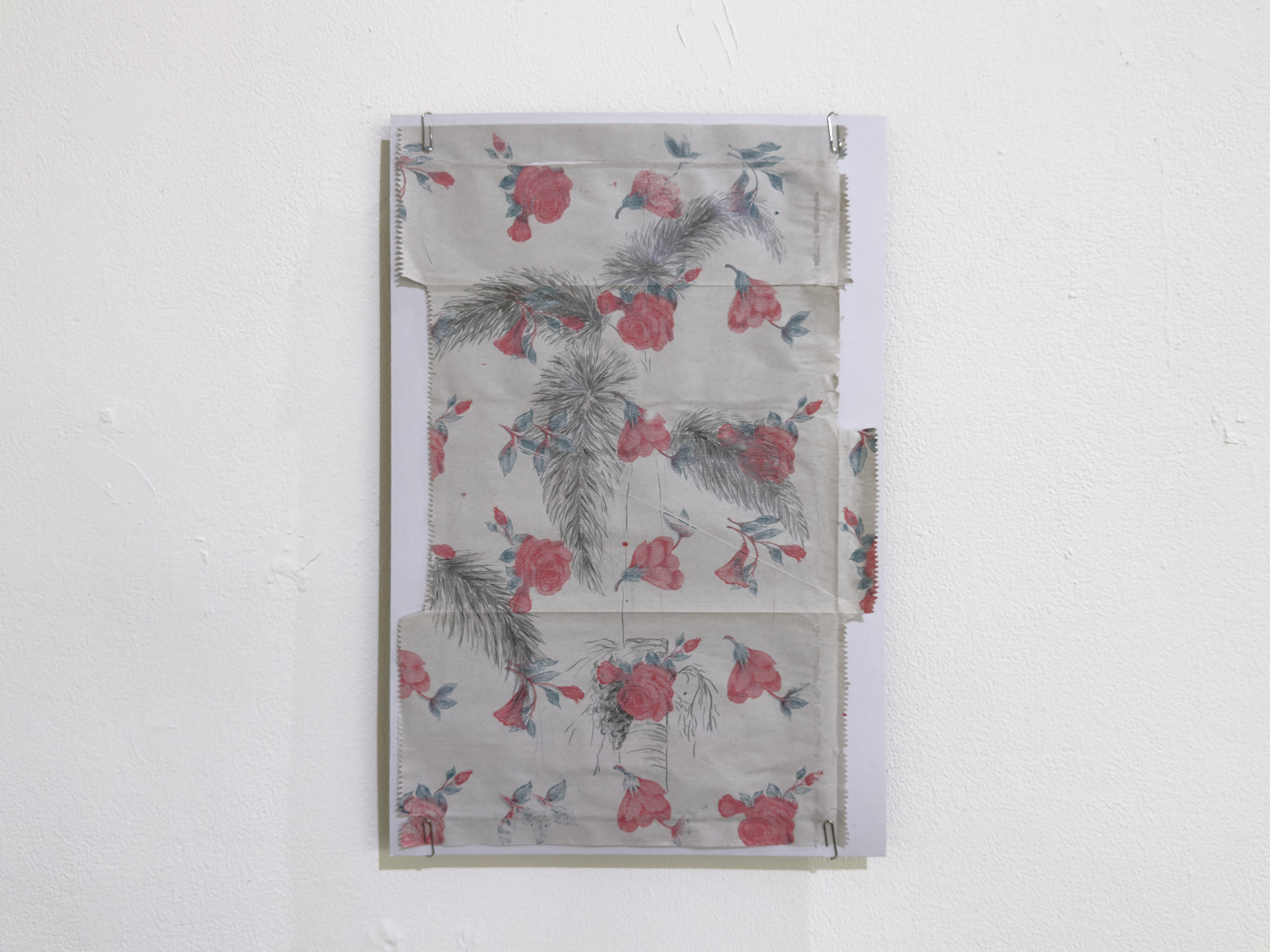 The paper bags from the stationery store carry a striking kind of print—ink so thin it slips away, colors misaligned, giving the surface an effortlessly casual quality. And it is precisely because of this incompleteness that small openings for intervention begin to appear. I wove into these prints the vigorous, wild roadside plants I encountered, letting them merge and unfold together into a single landscape.